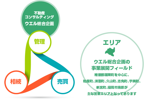 ウエル総合企画では、不動産コンサルティングマスターとCPM®(米国不動産経営管理士)の資格を持つ弊社スタッフと、当社提携の弁護士、司法書士、税理士、建築士などの他の有資格者と連携し、不動産コンサルティング、売買仲介や買取再販から、土地・アパート・マンション・駐車場の無料査定、不動産の管理・開発・有効活用まで、ワンストップでスムーズに、お客様目線による不動産運用のサポートを行います。